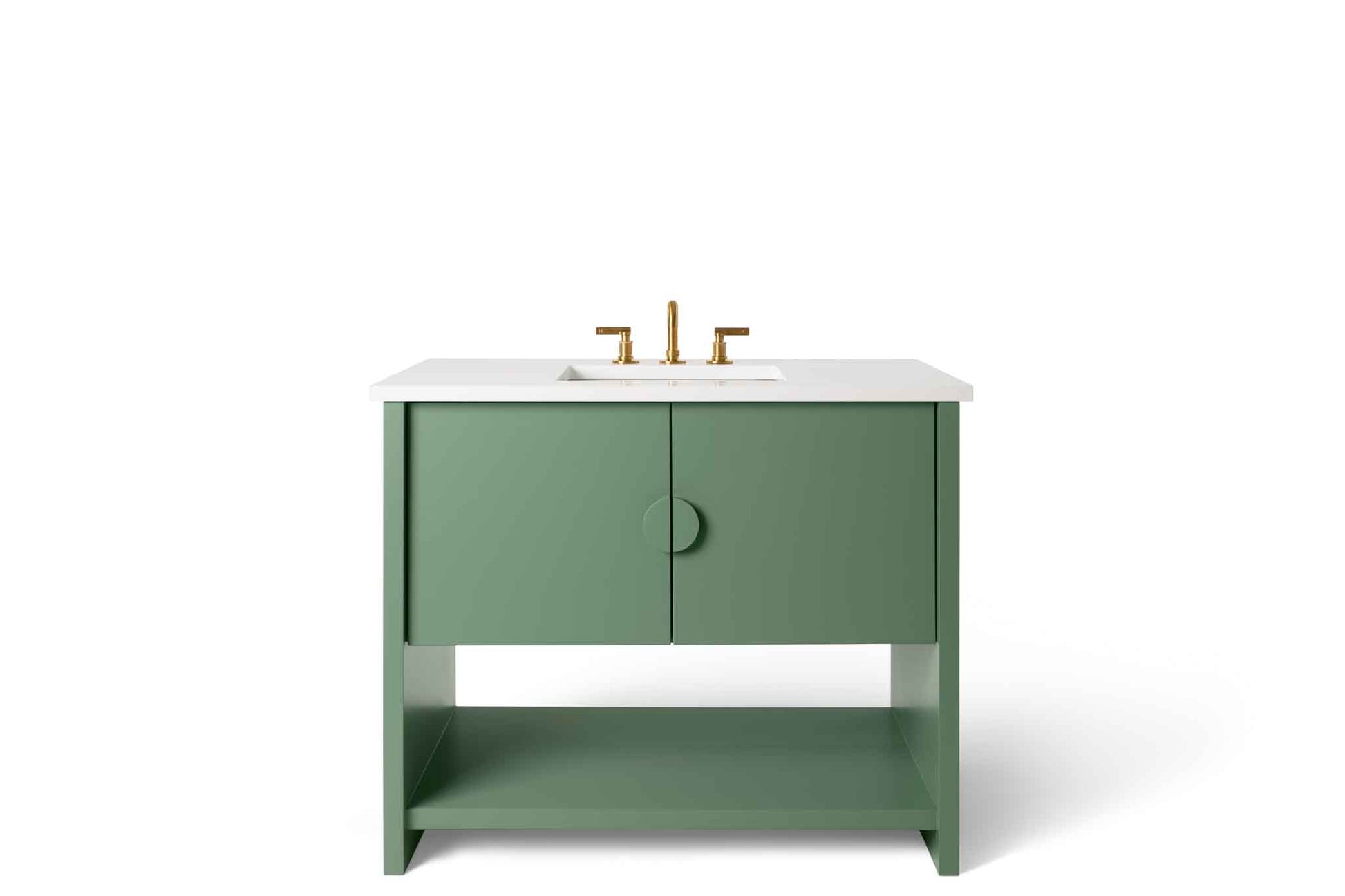 This midcentury modern-inspired vanity brings effortless style and function to your bathroom. The design features soft close cabinet doors and an open shelf. The integrated half-moon wood hardware adds a playful touch. Perfect for small spaces or anyone who loves a bit of retro flair, this vanity is as stylish as it is functional.